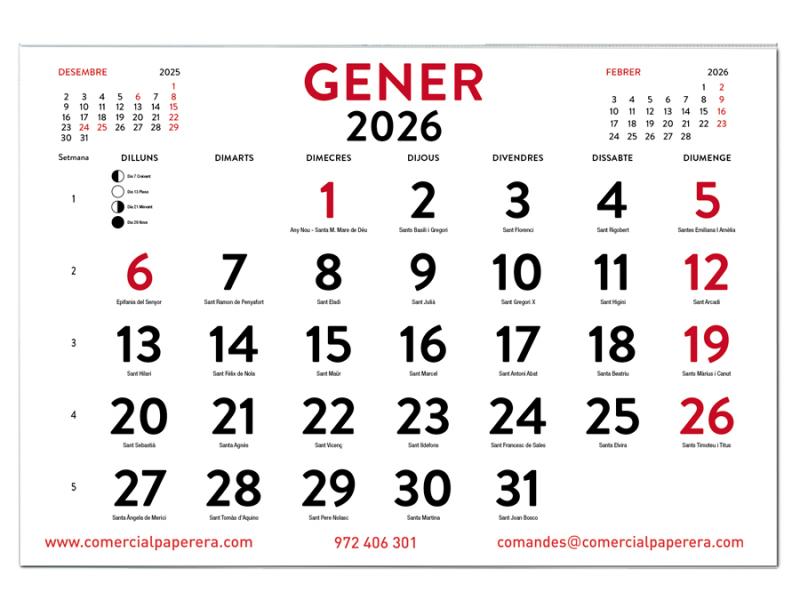 Demani'ns el nostre calendari de paret personalitzat, amb faldilla pròpia i números nets i clars.