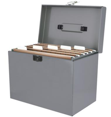 Maletí metàl·lic amb pany i clau per a carpetes penjants A4. Capacitat entre 15 i 20 carpetes. Inclou 5 carpetes. Mida 29,5 x 22 x 37 cm d’alçada.
