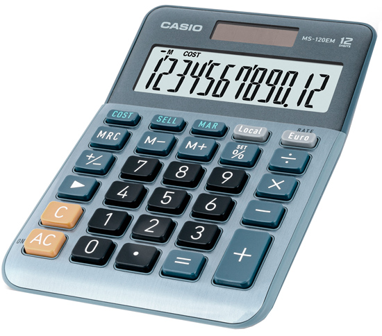 Calculadora Casio MS-120EM 12 dígits. Tecles d'Euro, retrocés i doble zero. Alimentació solar / pila*. Mida 15 x 10 cm. * Pila inclosa V10GA/LR54, codi 67907V.