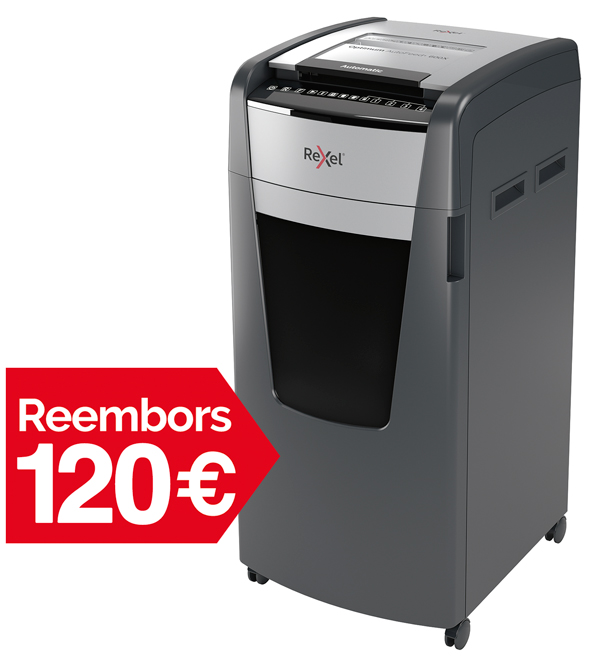 Destructora REXEL OPTIMUM AutoFeed 600X de gran volum. - Boca d'entrada 23 cm. - Capacitat màxima de destrucció: 600 fulls de 80 g en automàtic i 15 fulls de 80 g en manual. - Tall en partícules de 4 x 36 mm. - Nivell de seguretat P-4. - Admet grapes, clips i targetes de crèdit. - Dipòsit extraïble de 110 litres. - Bloqueig amb codi personal per a la destrucció segura. - Funcionament silenciós (55 dB). - Potència 450 W. - 4 rodes. - Mida 51 x 57 x 103 cm d'alçada.