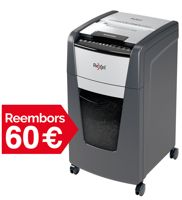 Destructora REXEL OPTIMUM AutoFeed 300X per a l'oficina. - Boca d'entrada 23 cm. - Capacitat màxima de destrucció: 300 fulls de 80 g en automàtic i 10 fulls de 80 g en manual. - Tall en partícules de 4 x 25 mm. - Nivell de seguretat P-4. - Admet grapes, clips i targetes de crèdit. - Dipòsit extraïble de 60 litres. - Bloqueig amb codi personal per a la destrucció segura. - Funcionament silenciós (55 dB). - Potència 400 W. - 4 rodes. - Mida 41,5 x 46,5 x 80,5 cm d'alçada.