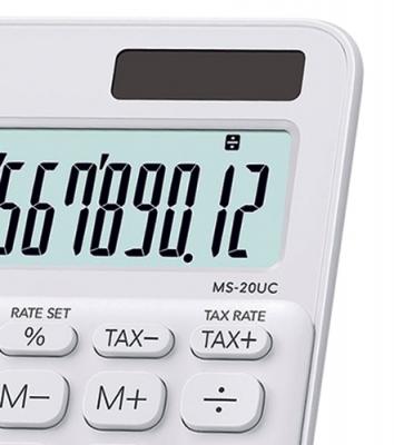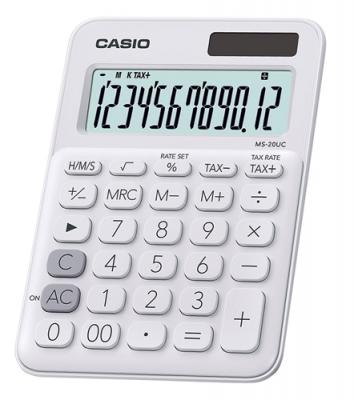 Calculadora Casio MS-20UC 12 dígits. Tecles d’arrel quadrada, memòria i retrocés. Càlcul de taxes i costos. Alimentació solar / pila. Mida 14,5 x 10,5 cm.