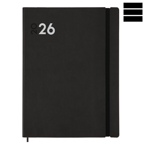 Agenda MARA Dia Pàgina. Tapes semiflexibles de material sintètic. Tancament amb goma. Paper de 80 g imprès a 2 tintes. Conté: dades personals, plàning anual, calendari, dies festius nacionals i autonòmics, horaris, notes i índex telefònic. Idioma principal català (català, francès, euskera, portuguès i anglès). Mida A4 21 x 27 cm.