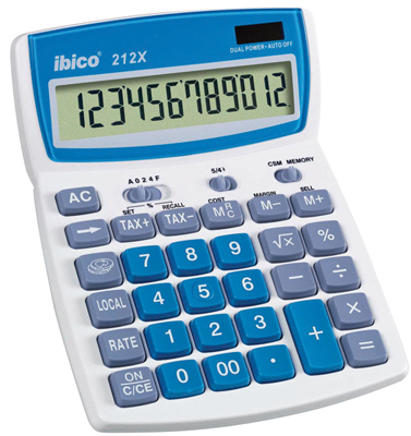Calculadora Ibico 212X 12 dígits. Selector de decimals. Càlcul d’impostos, tecles de retrocés i doble zero. Alimentació solar / pila*. Mida 19 x 14 cm.