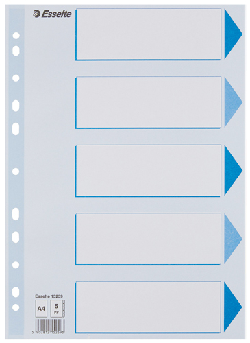 Joc de separadors de polipropilè opac 125 micres. Caràtula frontal de color amb multitrepant reforçat. Joc de 5 pestanyes. Mida A4.