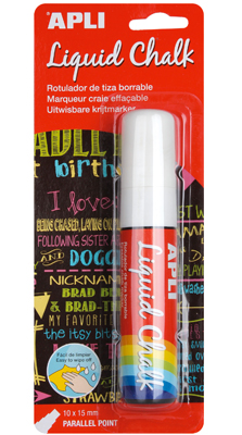 Retolador Apli Liquid Chalk punta gruixuda. Tinta blanca. Tinta especial per a pissarra verda i negra no porosa. També apte per altres superfícies no poroses com el vidre, alumini, etc. Punta bisellada de 10 x 15 mm. Tinta esborrable amb aigua!