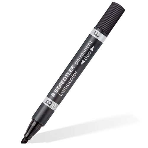 Retolador Staedtler Lumocolor de tinta permanent amb doble punta, cònica i bisellada. Punta de fibra cònica F de 0,6 mm i punta de fibra bisellada B d'1,5 mm a 4 mm.