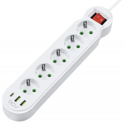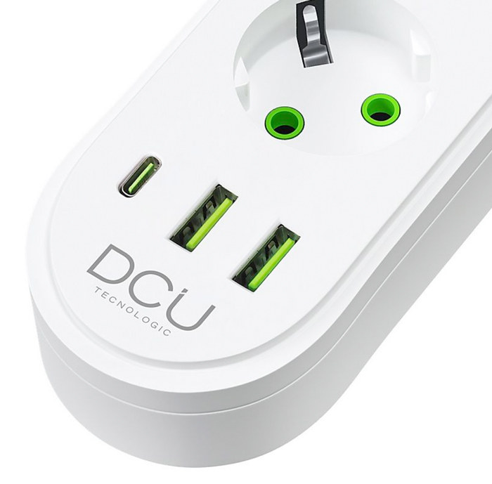 Regleta de 5 preses d'endoll + 2 ports USB-A + 1 port USB-C. Protecció contra sobrecorrent (OCP), sobrecàrrega (OLP), sobretemperatura (OTP) i curtcircuits (SCP). Interruptor d'alimentació. Certificació CE. Cable de 2 metres.