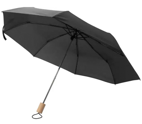 Paraigua plegable amb mànec de fusta de roure. Tela de polièster i tancament amb velcro. Mida Ø 97 cm de diàmetre i 59,5 cm d’alt (obert).