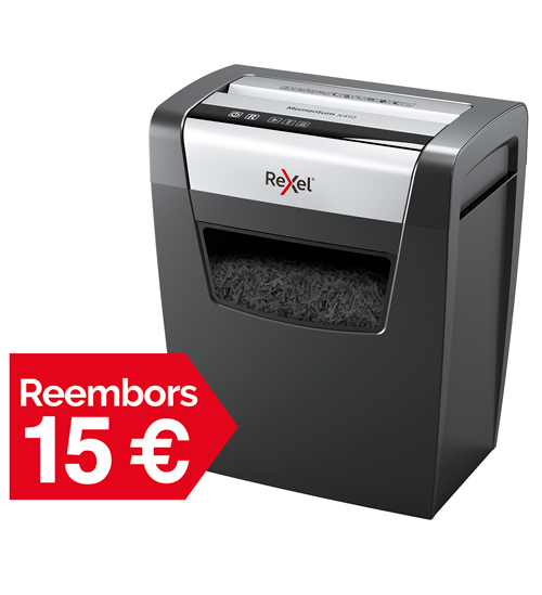 Destructora REXEL Momentum X410 personal o per a l'oficina. - Boca d'entrada 22 cm. - Capacitat màxima de destrucció 10 fulls de 80 g. - Tall en partícules de 4 x 28 mm. - Nivell de seguretat P-4. - Admet grapes i clips. - Dipòsit, capacitat 23 litres. - Funcionament silenciós (62 dB). - Funciona durant 6 minuts seguits. - Potència 280 W. - Mida 35,5 x 24 x 42 cm d'alçada.