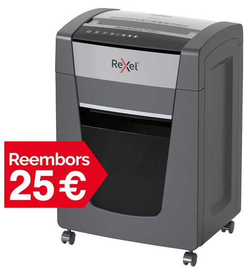 Destructora REXEL Momentum P420+ per a l'oficina. - Boca d'entrada 23 cm. - Capacitat màxima de destrucció 20 fulls de 80 g. - Tall en partícules de 4 x 35 mm. - Nivell de seguretat P-4. - Admet grapes i clips. - Dipòsit extraïble, capacitat 30 litres. - Funcionament silenciós (55 dB). - Funciona durant 4 hores seguides. - Potència 500 W. 4 rodes. - Mida 40,5 x 32 x 65,5 cm d'alçada.