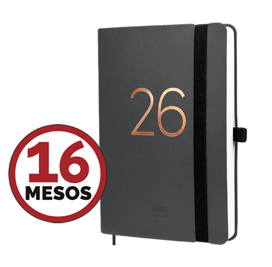 Agenda Capri 16 MESOS 2025-2026. Setmana Vista Horitzontal. Tapes flexibles de material sintètic. Paper de 80 g i imprès a 2 tintes. Tancament amb goma elàstica, anella portabolígraf i cinta índex. Planificació mensual i fulls per a notes i contactes. Idioma català. Mida 11,8 x 17 cm.