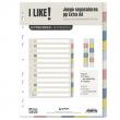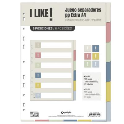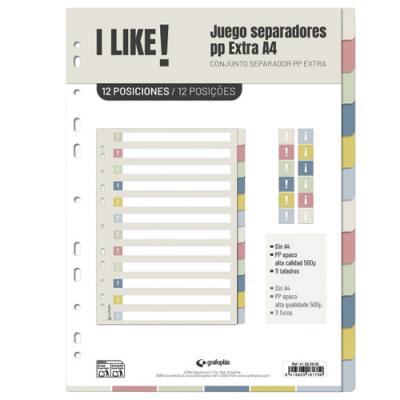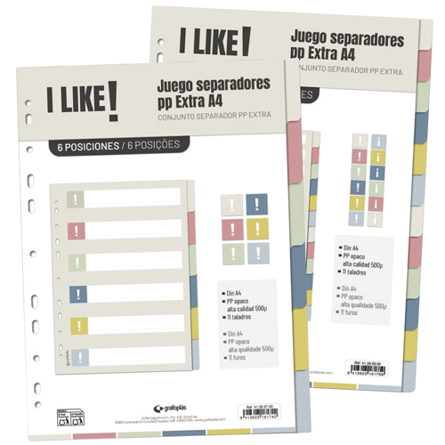 Jocs de separadors de polipropilè rígid 500 micres. Caràtula frontal. Joc de 6 o 12 pestanyes. Mida A4. Banda amb 11 taladres.