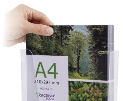 Displays per penjar a la paret. Poliestirè transparent de 2 mm. Cargols de fixació no inclosos. 4 cm de fons. CODI 41221 mida A4 41222 mida A5 41223 mida Tríptic