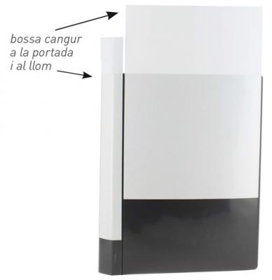 Carpeta de fundes cangur. Tapes rígides de polipropilè opac negre. Bossa cangur a la portada i al llom. Butxaca interior. Fundes transparents amb acabat cristall. Mida A4.