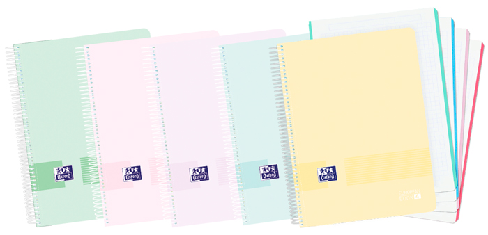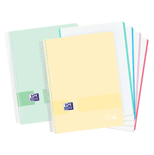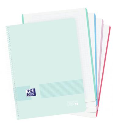Quadern European Book amb tapes de polipropilè colors pastel. Paper 90 g quadriculat de 5 mm i microperforat amb banda de color (30 fulls x color). 120 fulls. Mida A6.