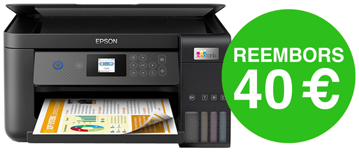 PROMOCIÓ REEMBORS EPSON 40 € Per a compres realitzades de l'1.09.2025 al 31.12.2025 Per sol·licitar el reembors de 40€ cal emplenar el formulari en línia i adjuntar còpia del justificant de compra + foto del número de sèrie de la caixa. Disposa de 30 dies naturals després de la compra. Trobarà el formulari AQUÍ. Consulti les condicions AQUÍ.