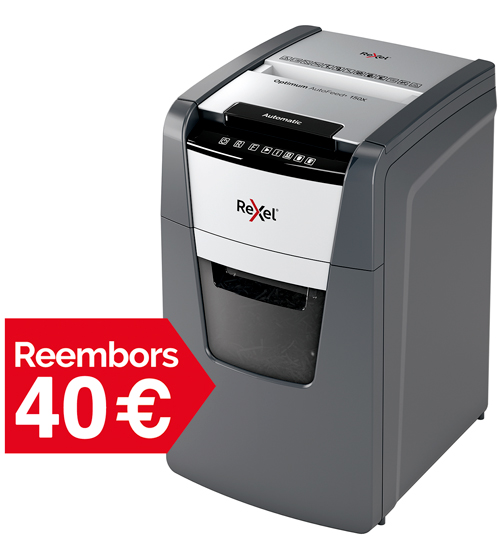 Destructora REXEL OPTIMUM AutoFeed 150X per a l'oficina. - Boca d'entrada 22 cm. - Capacitat màxima de destrucció: 150 fulls de 80 g en automàtic i 8 fulls de 80 g en manual. - Tall en partícules de 4 x 28 mm. - Nivell de seguretat P-4. - Admet grapes, clips i targetes de crèdit. - Dipòsit extraïble de 44 litres. - Sensor de dipòsit ple. - Funcionament silenciós (55 dB). - Potència 300 W. - Mida 36,5 x 43 x 61,8 cm d'alçada.