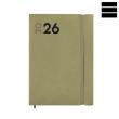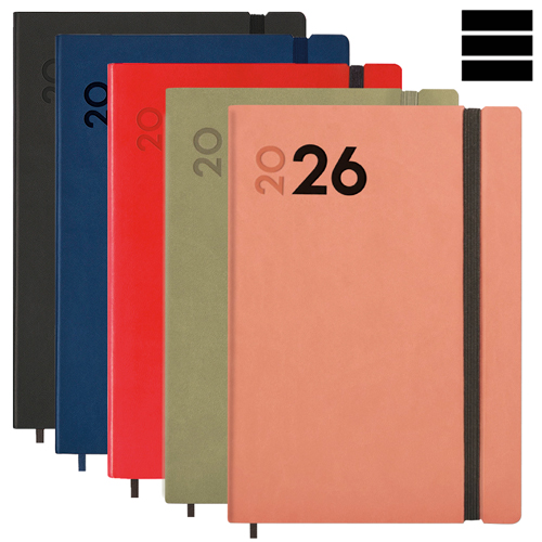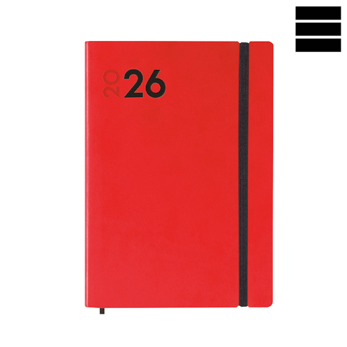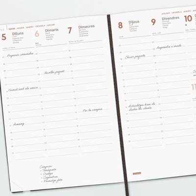Agenda MARA Setmana Vista vertical. Tapes semiflexibles de material sintètic. Tancament amb goma. Paper de 80 g imprès a 2 tintes. Conté: dades personals, plàning anual, calendari, dies festius nacionals i autonòmics, horaris, notes i índex telefònic. Idioma principal català (català, francès, euskera, portuguès i anglès). Mida A5 14 x 20,4 cm.