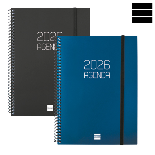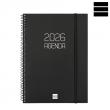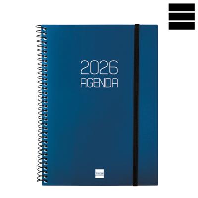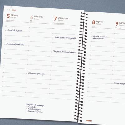 Agenda OPAQUE Setmana Vista vertical. Tapes semiflexibles de polipropilè opac i espiral. Tancament amb goma. Paper de 80 g imprès a 2 tintes. Conté: dades personals, plàning anual, calendari, horari, notes i índex telefònic. Idioma català. Mida A5 15,5 x 21,2 cm.