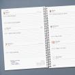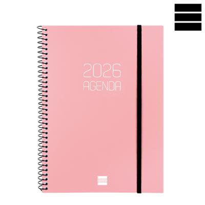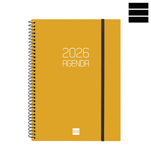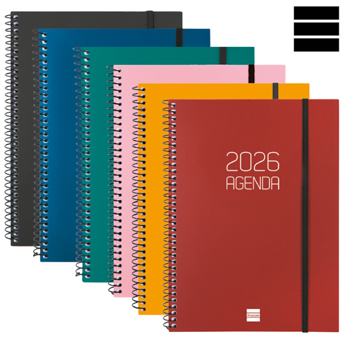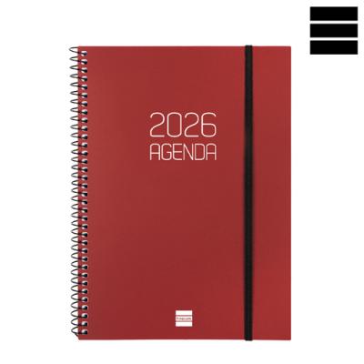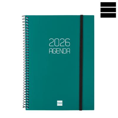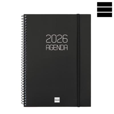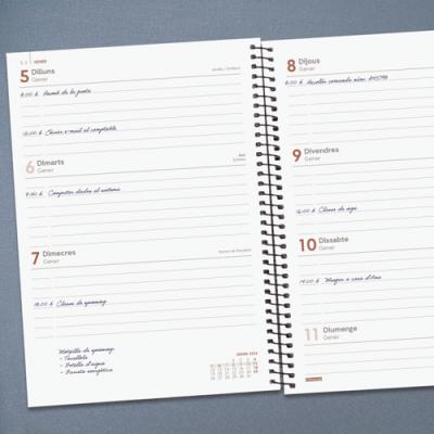 Agenda OPAQUE Setmana Vista horitzontal. Tapes semiflexibles de polipropilè opac i espiral. Tancament amb goma. Paper de 80 g imprès a 2 tintes. Conté: dades personals, plàning anual, calendari, horari, notes i índex telefònic. Idioma català. Mida A5 15,5 x 21,2 cm.