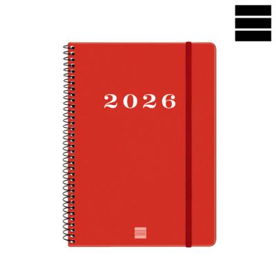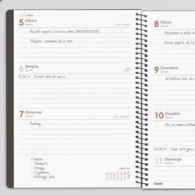 Agenda Espiral My Setmana Vista horitzontal. Tapes de cartró i espiral. Quadern espiral de 80 g imprès a 2 tintes. Conté: dades personals, plàning anual, calendari, dies festius nacionals i autonòmics, horaris, notes i índex telefònic. Idioma català. Mida A5 15,5 x 21,2 cm.