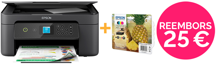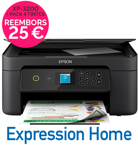 PROMOCIÓ REEMBORS IMPRESSORA + MULTIPACK TINTA 604XL Per a compres realitzades de l'1.09.2025 al 31.12.2025 (Reembors de 25€ al comprar conjuntament l'impressora XP-3200 + un pack 4 colors 604XL, codi 95667) Per sol·licitar el reembors de 25€ cal emplenar el formulari en línia i adjuntar còpia del justificant de compra, foto del número de sèrie de la caixa i foto del codi de barres de la caixa del multipack tinta. Disposa de 30 dies naturals després de la compra. Trobarà el formulari AQUÍ. Consulti les condicions AQUÍ.