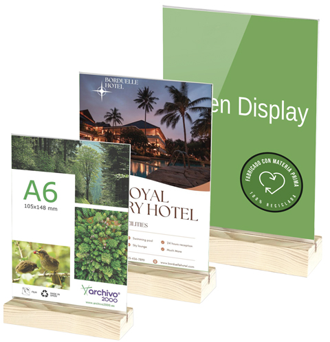 Display portacartell en forma de T de sobretaula vertical amb base de fusta. Metacrilat transparent. Apte a dues cares. CODI MIDA VERTICAL (full i exterior) 41225 A4 33 x 21 x 4 cm 41226 A5 24 x 15 x 4 cm 41227 A6 17 x 10,5 x 3 cm 41228 A7 12,5 x 7,5 x 3 cm