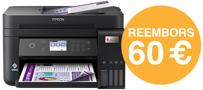 PROMOCIÓ REEMBORS EPSON 60 € Per a compres realitzades de l'1.09.2025 al 31.12.2025 Per sol·licitar el reembors de 60€ cal emplenar el formulari en línia i adjuntar còpia del justificant de compra + foto del número de sèrie de la caixa. Disposa de 30 dies naturals després de la compra. Trobarà el formulari AQUÍ. Consulti les condicions AQUÍ.