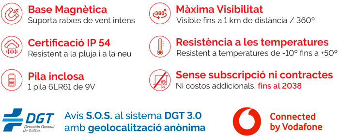 A partir de l'1 de gener de 2026 serà obligatòri l'ús de dispositius V16 i que disposin de geolocalització. Tots els dispositius sense geolocalització deixaran de ser vàlids a Espanya, encara que actualment estiguin homologats, i el seu ús pot comportar una multa de 200 €. NORMATIVA DISPOSITIUS D'EMERGÈNCIA V16 AMB GEOLOCALITZACIO.pdf Cost de les comunicacions i servei de dades inclòs i garantit fins al 2038 sense cost addicional. Dissenyada sota els criteris de la certificació IP54, es pot fer servir sota les més exigents condicions meteorològiques, com pluja, pols, vent, fred extrem o pols.