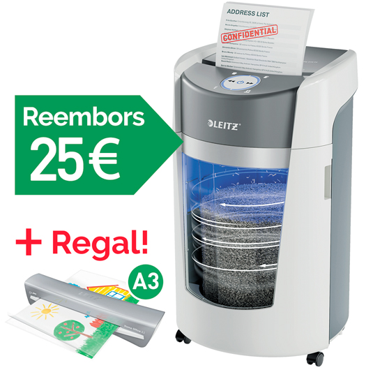 PROMOCIÓ REGAL PLASTIFICADORA iLAM HOME OFFICE A3 Per a compres realitzades de l'1.02.2026 al 28.02.2027 Per sol·licitar el seu regal cal emplenar el formulari en línia i adjuntar còpia del justificant de compra. Trobarà el formulari AQUÍ. Consulti les condicions AQUÍ. REGAL! Plastificadora fins a 125 micres. Mida 48 x 13 x 9,5 cm d'alçada. FITXA TÈCNICA DESTRUCTORA LEITZ OPTIMAX OFFICE P5 MANUAL DESTRUCTORA LEITZ OPTIMAX OFFICE 550 P5 (ES)