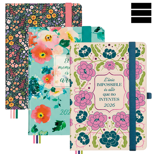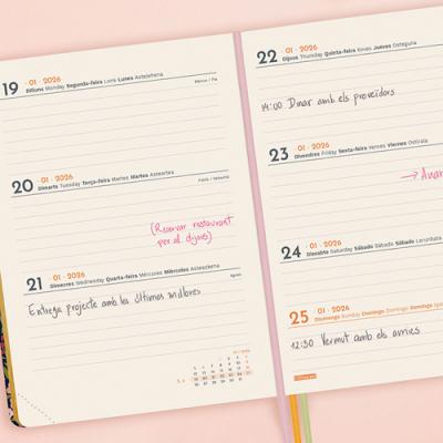 Agenda MÍNIMAL Design Setmana Vista horitzontal. Tapes dures de cartró folrat de material sintètic. Tancament amb goma. Paper crema de 80 g imprès a 2 tintes. Conté dades personals, plàning anual, calendari, horaris, notes i índex telefònic. Idioma principal català (català, castellà, gallec, euskera, portuguès i anglès).