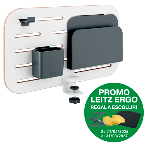 Panell organitzador d'escriptori Leitz Ergo. Permet guanyar espai amb l'emmagatzematge vertical i tenir més espai a l'escriptori, a més d'un espai de treball ergonòmic. El panell de MDF de 8 mm de gruix garanteix resistència i estabilitat. Amb 1 ganxo a la part posterior i diferents elements organtizadors: suport per a bloc de notes, suport per a bolígrafs i suport per a auriculars. Mida 25 x 42 cm d'ample. Subjecció amb pinça per a taules d’entre 1 i 3,5 cm.