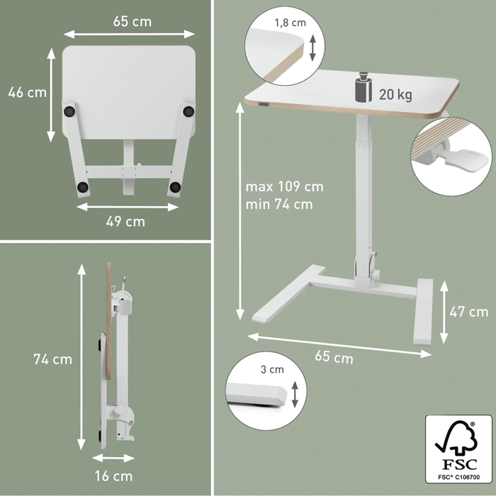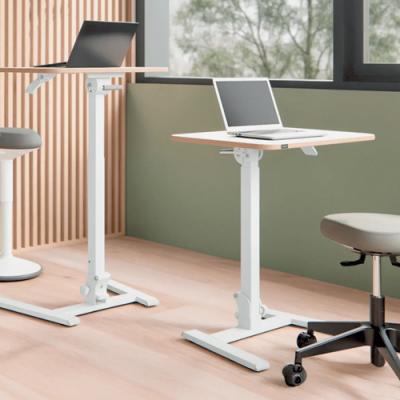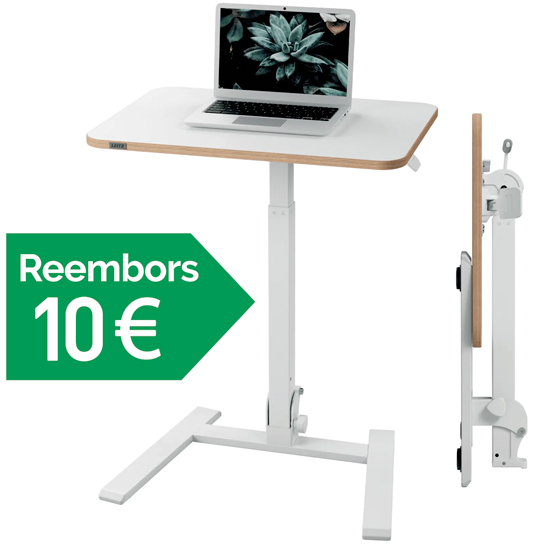 Taula escriptori plegable Leitz Ergo amb regulació pneumàtica d'alçada. - Escriptori i peus totalment plegables fins a 16 cm d'amplada. Fàcil de moure, muntar i col·locar a qualsevol lloc. - Pensada per permetre als usuaris anar canviant la posició de la taula per treballar assegut o dret. - Es pot utilitzar en posició inclinada amb el topall extraïble per a ordinador portàtil inclòs. - Regulació d'alçada de 74 a 109 cm amb un suau ajustament pneumàtic. - Potes ajustables amb protecció al terra. Nansa pel transport. Pes 11 kg. - Suporta fins a 20 kg. - Tauler mida 46 x 65 x 1,8 cm.