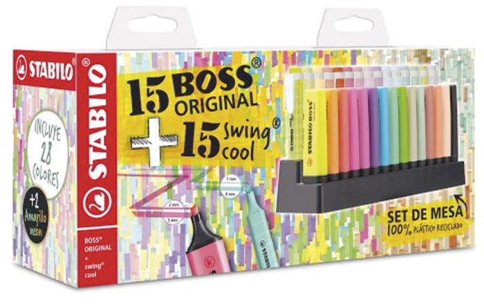 Retolador fluorescent Stabilo Boss i Stabilo Swing Cool: joc 15 + 15. Joc de sobretaula amb 15 retoladors Boss + 15 retoladors Swing. Conté: 9u - BOSS ORIGINAL (70/24, 54, 40, 56, 58, 55, 31, 51 i 53), 5u - BOSS Nature colors (70/137, 163, 165, 175 i 186), 1u - BOSS negre (70/46), 14u.-SWING COOL Pastel (275/144-8, 125-8, 126-8, 140-8, 150-8, 129-8, 158-8, 155-8, 111-8, 112-8, 113-8, 116-8, 133-8 i 275/194-8). 1u - SWING COOL Vivid yellow(275/24)