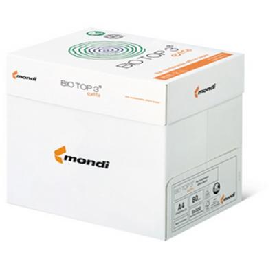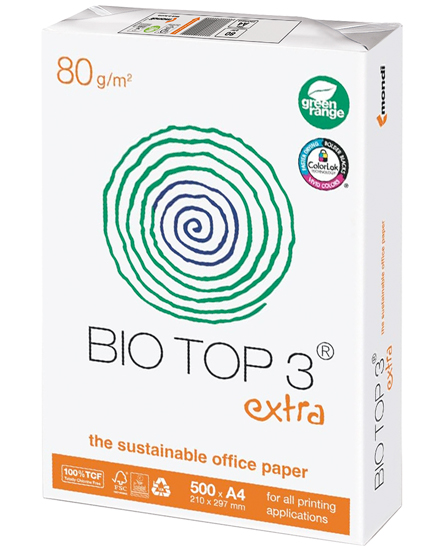 Paper BIO TOP 3® next. Paper certificat FSC i Ecolabel. Paper blanc natural, color os. Blancor 85,5 (ISO 2471). Produït íntegrament amb blanqueig sense clor (TCF) i sense blanquejants òptics (OBA). Multiús de qualitat superior, molt versàtil i amb una excel·lent reproducció de color. Alta flexibilitat i rendiment. Paquet de 500 fulls de 80 g.