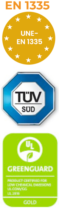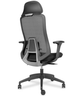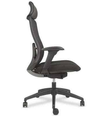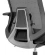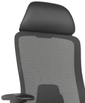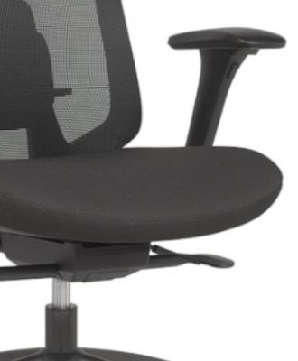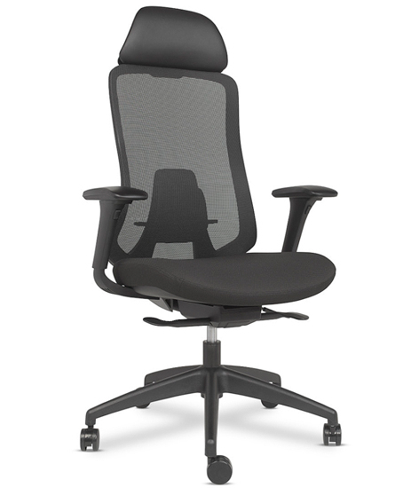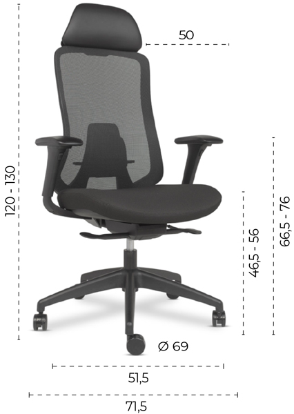 Cadira d'oficina amb braços i reposacaps. Base i carcassa de color negre. Seient i reposacaps entapissats amb tela ignífuga. Respatller de malla transpirable ultra-resistent sobre estructura de poliamida + fibra de vidre (25%). Mecanisme de contacte permanent i basculant, ancoratge en 4 posicions. Regulació de la profunditat del seient. Reforç lumbar “lliure”, regulable en alçada. Seient giratori 360º. Alçada graduable amb pistó de gas. Reposacaps regulable en alçada. Base de niló amb fibra de vidre i rodes silencioses. Braços 4D graduables en alçada, profunditat, amplada i rotació del reposabraços.