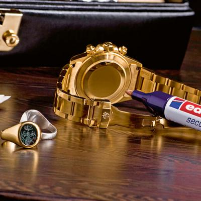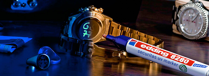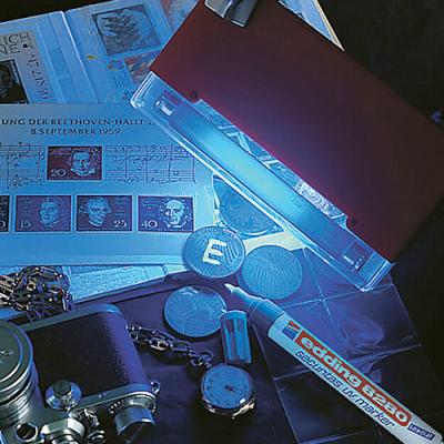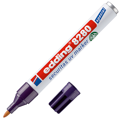 Retolador permanent Edding Securitas UV 8280 ultravioleta. Tinta permanent d'assecat ràpid, apte per a quasi totes les superfícies. Tinta no fluorescent, només és visible sota llum ultraviolada. Punta cònica d'1,5-3 mm de traç. Cos d'alumini 100% reciclat. La tinta resistent a l'aigua i al desgast ofereix un plus de seguretat (resistència d'uns 2 anys o més, segons l'exposició a la llum solar). Es pot eliminar la tinta amb alcohol i a les finestres, amb netejavidres (depèn també de les condicions climàtiques i l'exposició a la llum solar). Cos 100% de d'alumini reciclat post-consum.
