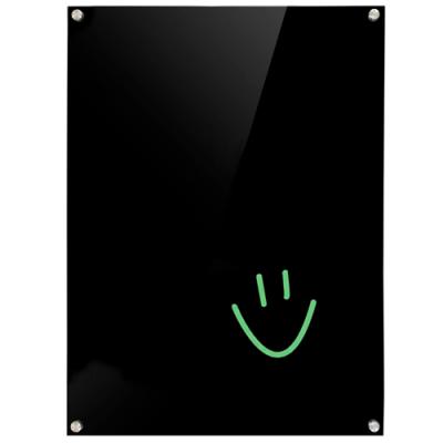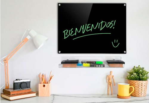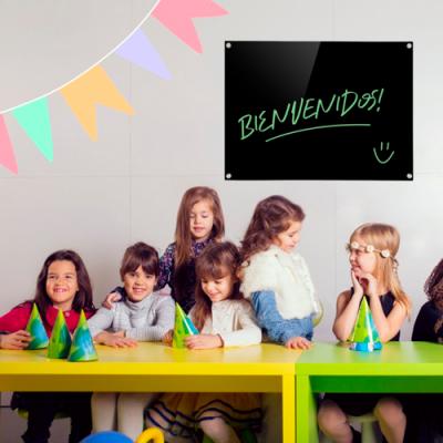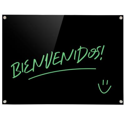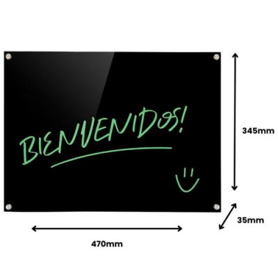 Pissarra negra de paret, apta en vertical i horitzontal. Metacrilat negre. Resistent als raigs UV, cops, taques i ratllades. Fàcil de netejar amb aigua i sabó. Inclou separadors i embellidors inox. Mida A3 - 47 x 34,5 x 3,5 cm. Ideal per escriure amb retoladors adequats per a vidre. Perfecte per mostrar menús, promocions, ofertes o qualsevol missatge als teus clients.