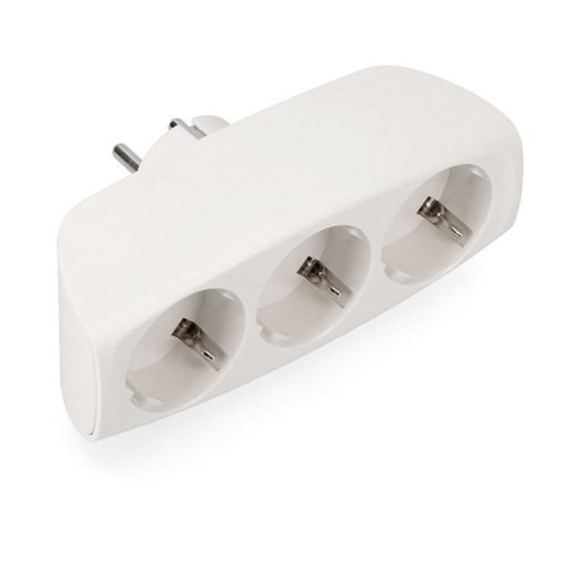 Endoll de paret amb triple sortida. 3 sortides tipus 'schuko" de 4,8 mm - Intensitat: 16A. - Tensió: 250V. - Potència màxima suportada: 3680W. - Diàmetre: 48 mm. Per a connectar varis dispositus alhora i aprofitar l'espai al màxim.