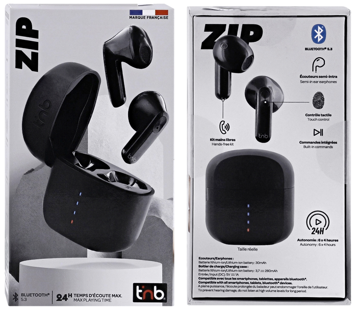 Auricular sense cables TNB ZIP 2 TWS Bluetooth. - Apte per escoltar música i rebre trucades. - Controls de trucada i música. Micròfon integrat. - Auricular estèreo Bluetooth 5.3. - Autonomia fins a 24 h. - Freqüència de 20 - 20000 Hz. - Sensibilitat de 96 dB. - Encesa / apagada automàtica. - Inclou estoig de càrrega i cable de càrrega USB-C. - Pes ultralleuger de 46 g. - Apte per a smartphones iOS i Android.
