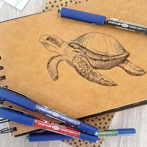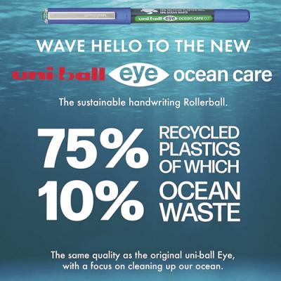 Retolador Uni-Ball Eye Ocean Care UB-150 de tinta líquida. Punta de bola inoxidable de 0,5 mm. Cos 75% de plàstic reciclat. * 75% de plàstic reciclat. El 10% són deixalles marines