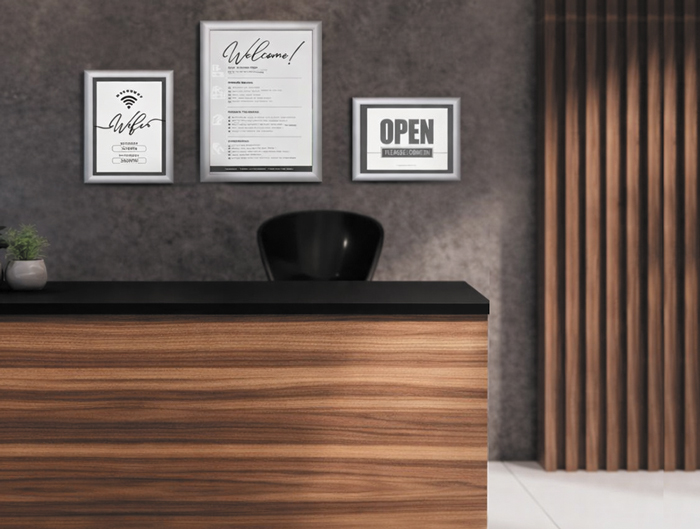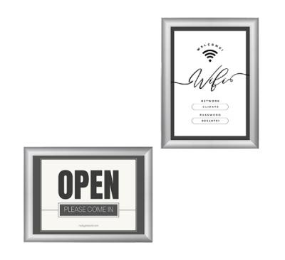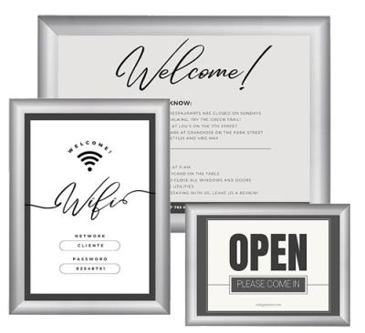 Portacartell amb marc d’alumini i tancament amb clip. Marc abatible que permet la substitució del pòster d’una manera ràpida i còmoda, sense haver de despenjar-lo de la paret. El pòster queda protegit per una làmina de plàstic transparent i antireflectant. Adaptable en vertical i horitzontal. Inclou forats i cargols de fixació. Marc de 2 cm d'amplada x 1 cm de profunditat. Codi 41336: mida 24 x 18 cm - per a full A5. Codi 41339: mida 33 x 24 cm - per a full A4. Codi 41340: mida 45 x 33 cm - per a full A3.
