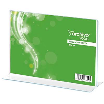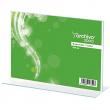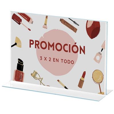 Displays portacartell en forma de T de sobretaula apaïsats. Poliestirè transparent d’1,5 mm (excepte mida A3: 2 mm). Aptes a dues cares. CODI MIDA HORITZONTAL (apaïsat) 41370 A4 21,5 x 30 x 8,5 cm 41371 A5 15,5 x 21 x 7,5 cm 41242 A6 11 x 15 x 4,4 cm