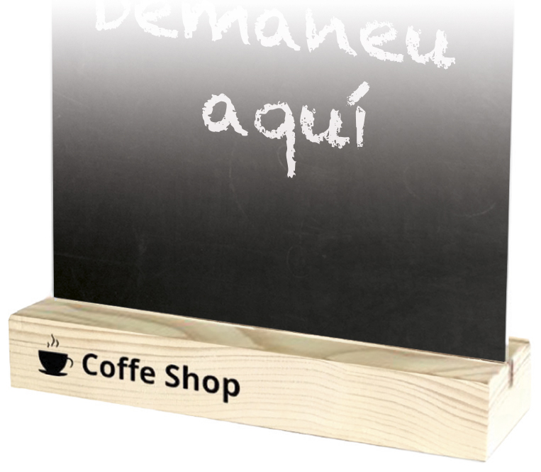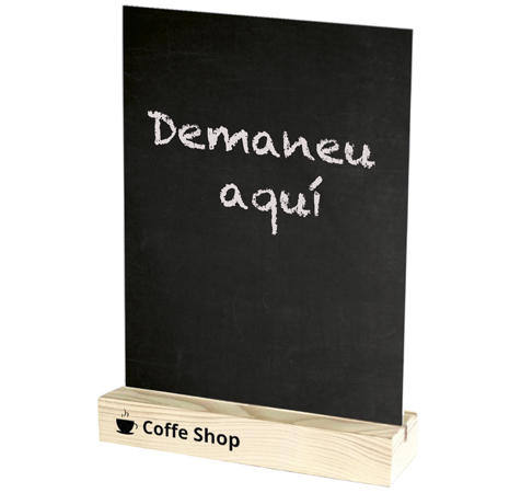 Pissarra de sobretaula en forma de T vertical i amb base de fusta personalitzable. Metacrilat negre. Resistent als raigs UV, cops, taques i ratllades. Fàcil de netejar amb aigua i sabó. Apte a dues cares. Mida estàndard A4. Base personalitzada amb el seu logo o imatge corporativa.