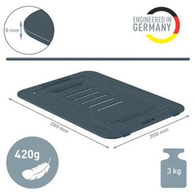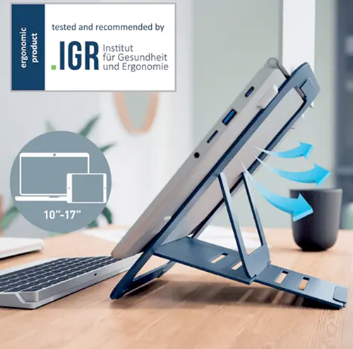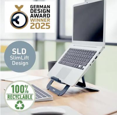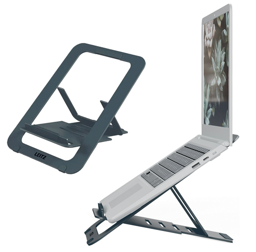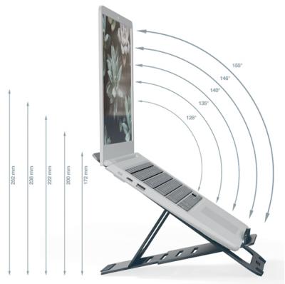 Suport d'alumini extra-prim per a portàtil/tauleta de fins a 17”. - Ajustable en 5 posicions d’alçada per a una correcta visió (inclinació fins a 155º). - Ranura per a una major ventilació del portàtil. - Lleuger i extra-fi: gruix 6 mm. Inclou funda. - Mida 30 x 21 cm.