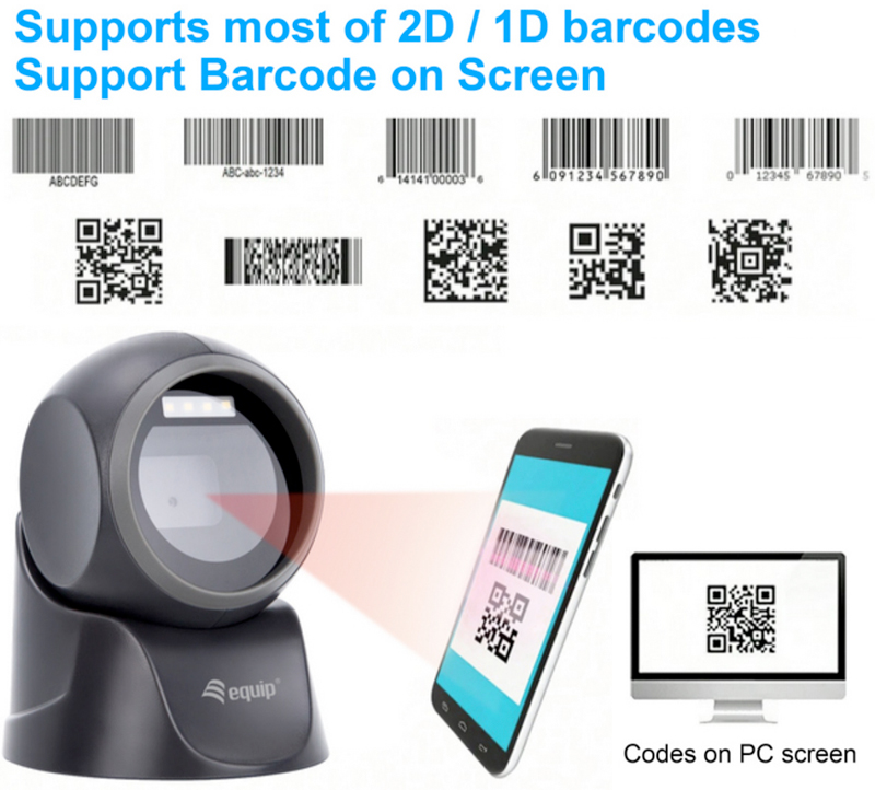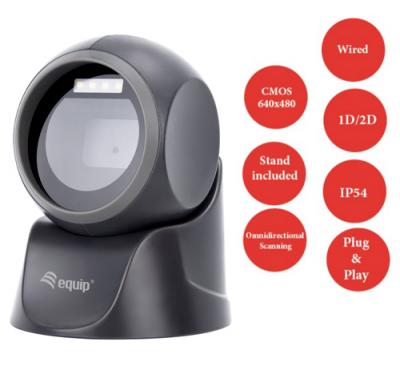 - Lector de codi de barres de sobretaula EQUIP 2D. - Funcions de lectura imager 2D (llegeix codis 1D i 2D, inclosos QR, Data Matrix i PDF417). - Escaneja codis en paper i pantalles digitals. - Sensor de 640 x 480 CMOS amb llum blanca. - Escaneig omnidireccional que permet la lectura des de qualsevol angle. - Permet Escaneig Manual, continu i d'autoinducció. - Connexió amb cable USB (inclòs). - Mida 120 x 110 x 146 mm. FITXA TÈCNICA LECTOR DE BARRES DE SOBRETAULA EQUIP 2D.pdf