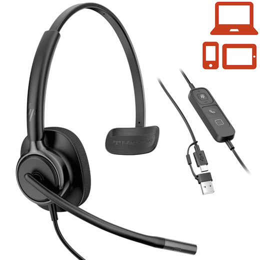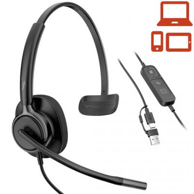 Auricular amb cable POLY Mission 415 Classic monoaural. - Àudio de banda ampla - Processament del senyal digital (DSP) - Micròfon amb anul·lació dels sorolls de l'entorn per a un so més natural i nítid. - SoundGuard protecció auditiva davant dels pics de so i per evitar la fatiga auditiva. - Controls de resposta i finalització de trucades, ajust de volum i silenci i boto directe per a Microsoft Teams. - Micròfon giratori. - Subjecció amb diadema de metall molt lleugera i ajustable. - Connexió amb Mac, Windows, Chrome OS, Android, iOS. - Connexió USB-C amb adaptador USB-A. procesador DA inclòs. - Cable de 2 metres. - Pes 97 g.