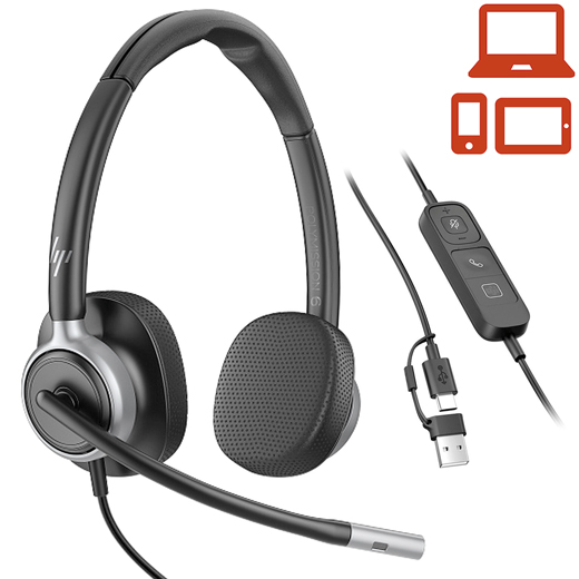 Auricular amb cable POLY Mission 625 Classic binaural. - Àudio de banda ampla - Processament del senyal digital (DSP) - Micròfon amb anul·lació dels sorolls de l'entorn per a un so més natural i nítid per us intensiu. - SoundGuard protecció auditiva davant dels pics de so i per evitar la fatiga auditiva. Reducció del soroll per IA. - Controls de resposta i finalització de trucades, ajust de volum i silenci i boto directe per a Microsoft Teams. - Micròfon giratori. - Alfombretes del auricular de pell amb espuma viscoelàstica. - Indicador LED vermell a 360º en funcionament de trucades. - Subjecció amb diadema de metall molt lleugera i ajustable. - Software de gestió HP Poly Studio. - Connexió amb Mac, Windows, Chrome OS, Android, iOS. - Connexió USB-C amb adaptador USB-A. procesador DA inclòs. - Cable de 2 metres. - Pes 147 g.