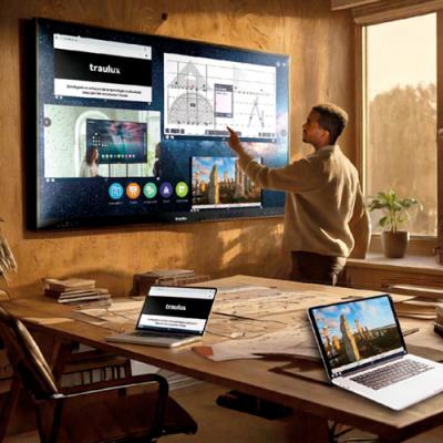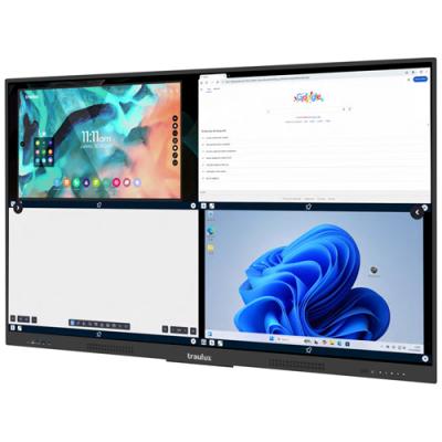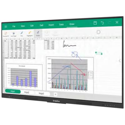 Monitor interactiu TRAULUX Performance. - Alta resolució 4K Ultra HD (3.840 x 2.160 px). - Sistema operatiu Android 13. Actualitzacions automàtiques (OTA). - Memòria RAM 8 GB. Memòria ROM 128 GB. - Pantalla multitàctil de fins a 20 punts d'escriptura, i 40 punts d'alta resistència. - Funció de pissarra interactiva. - Projecció simultània fins a 9 pantalles. - Lector d'arxius PDF i lector/editor Office. - Connexió 2x USB-C: 1 frontal amb càrrega de 65 Watt + 1 lateral 15 Watt (cable thunderbolt 3 inclòs). - Alta connectivitat, accés a internet, Wi-Fi i Hotspot. - Airplay, Miracast, Chromecast, WebCast, Camerasharing. * Modul opcional amb ordinador personal (Windows 11 Pro / Google EDLA). 3 mides de monitor disponibles: 65” (148x90cm d’alçada), 75” (172x103cm d’alçada) i 86” (196x117cm d’alçada).